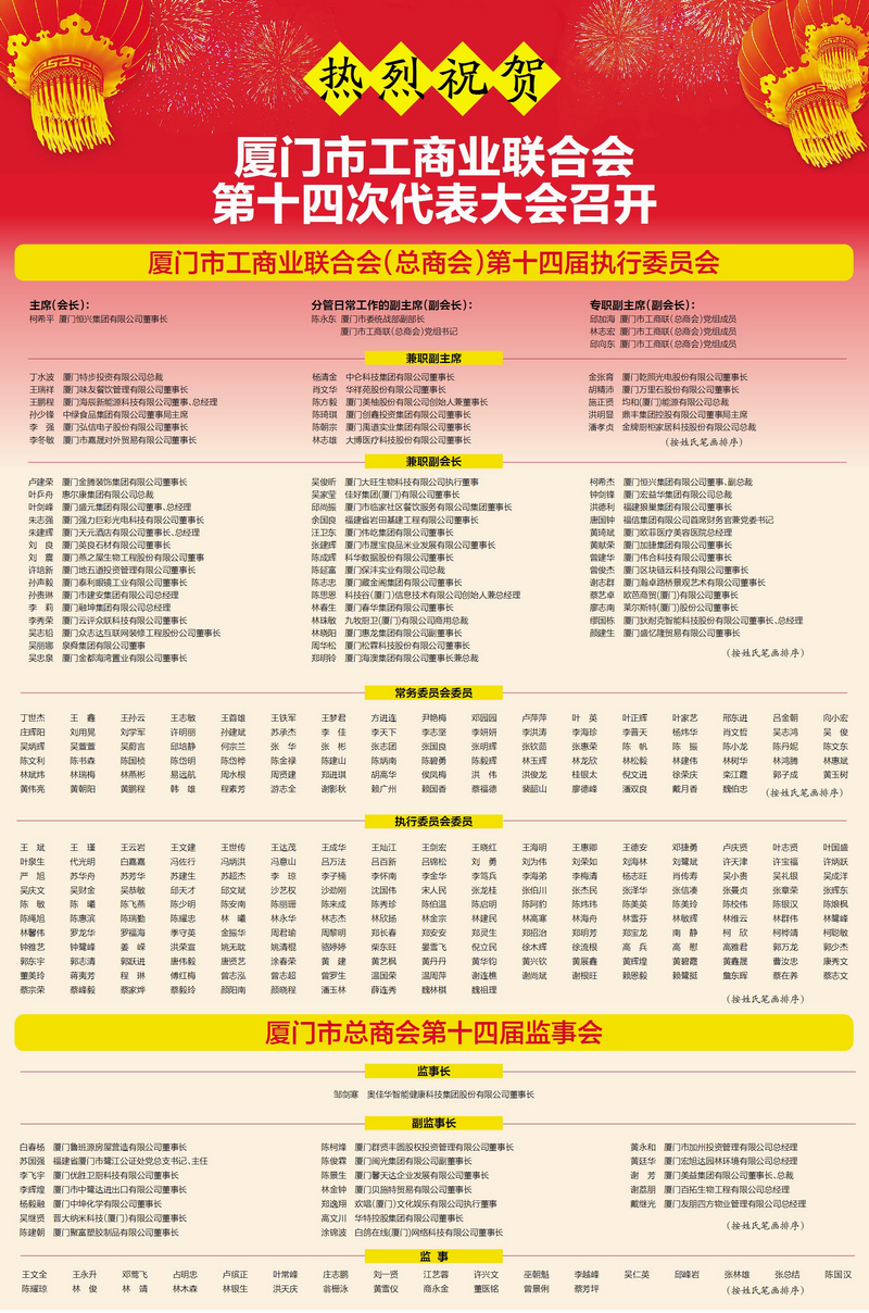 會(huì)議選舉產(chǎn)生廈門市工商業(yè)聯(lián)合會(huì)(總商會(huì))第十四屆執(zhí)行委員會(huì)、廈門市總商會(huì)第十四屆監(jiān)事會(huì)組成人員,恒興集團(tuán)董事長柯希平連任主席(會(huì)長),奧佳華集團(tuán)董事長鄒劍寒當(dāng)選監(jiān)事長。